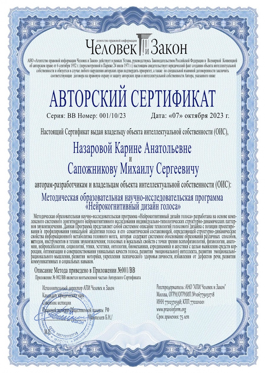 Методическая образовательная научно-исследовательская программа «Нейрокогнитивный дизайн голоса» разработана на основе комплексного системного лонгитюдного нейрокогнитивного исследования индивидуально-типологических структурно-динамических паттернов звукоизвлечения. Данная Программа представляет собой системное описание технологий голосового дизайна с позиции проектирования и профилирования уникальной айдентики голоса и его семантической составляющей, определяющей структурно-динамические свойства информационного метаболизма головного мозга, которая содержит системное обоснование образования различных способов, методов, инструментов и техник звукоизвлечения; голосовых и вокальных свойств с точки зрения психофизиологии, физиологии, анатомии, нейропсихологии, социологии, этики, эстетики, онтологии, биомеханики, аэродинамики и акустики с целью выявления средств коррекции, оптимизации и совершенствования уникальных качеств голоса, развития эмоционального интеллекта, развития эмоционально-рационального мышления, развития моторики, укрепления психического здоровья личности, избавления от деффектов речи, развития коммуникативных и социальных навыков.